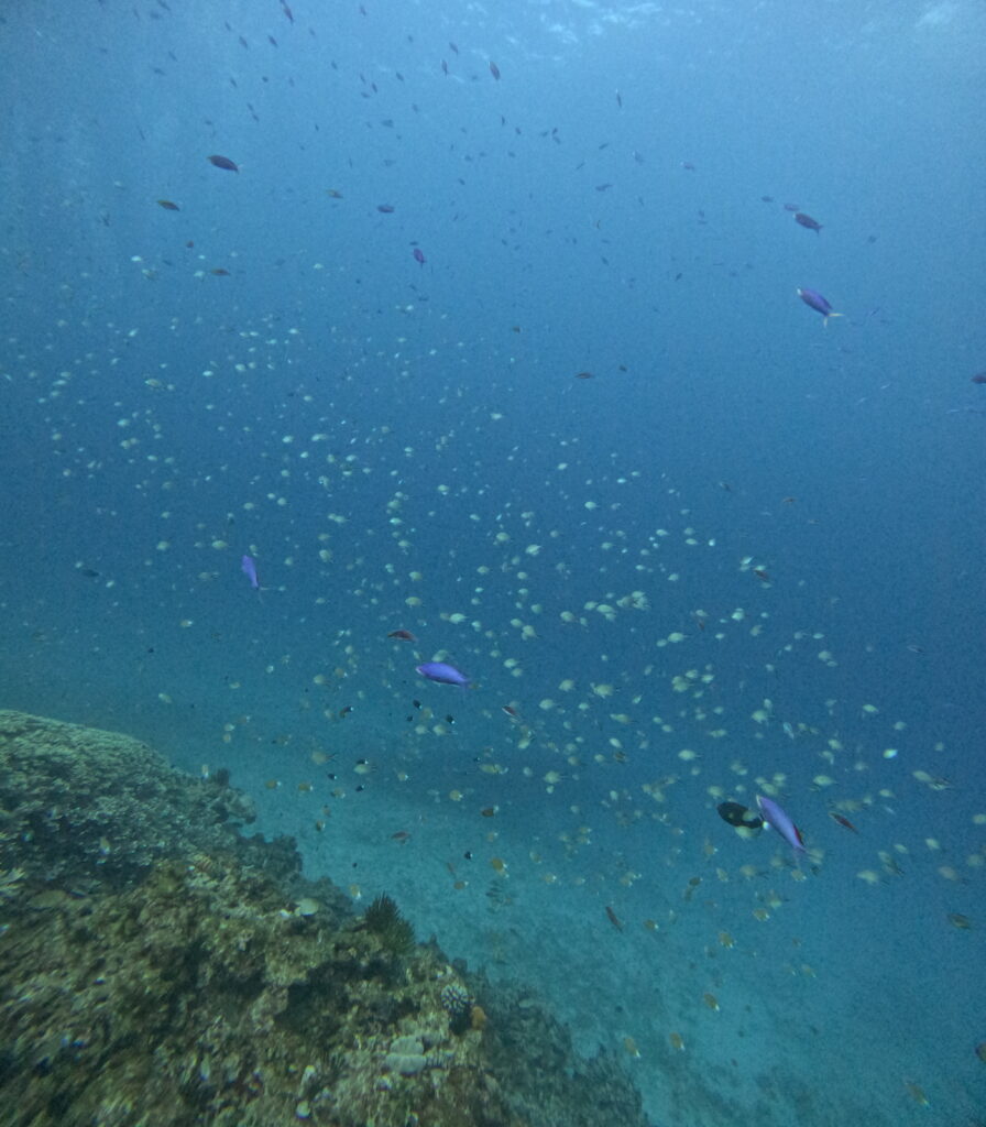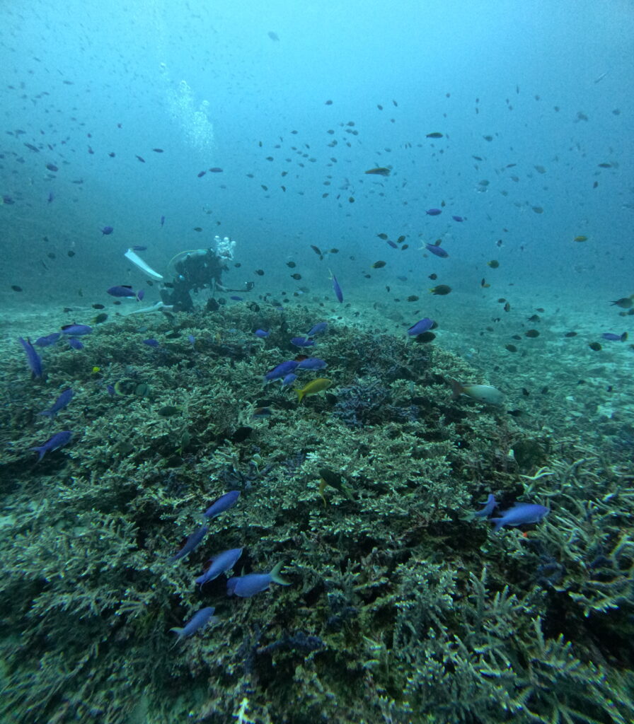 1本目はアンカーリングで「野崎」へ。エントリーしてすぐに、食事に夢中なタイマイに遭遇!ダイバーを気にせずムシャムシャと食べる姿を、じっくり観察できました。サンゴの上に群れるハナゴイの乱舞も、いつ見ても圧巻の美しさです。