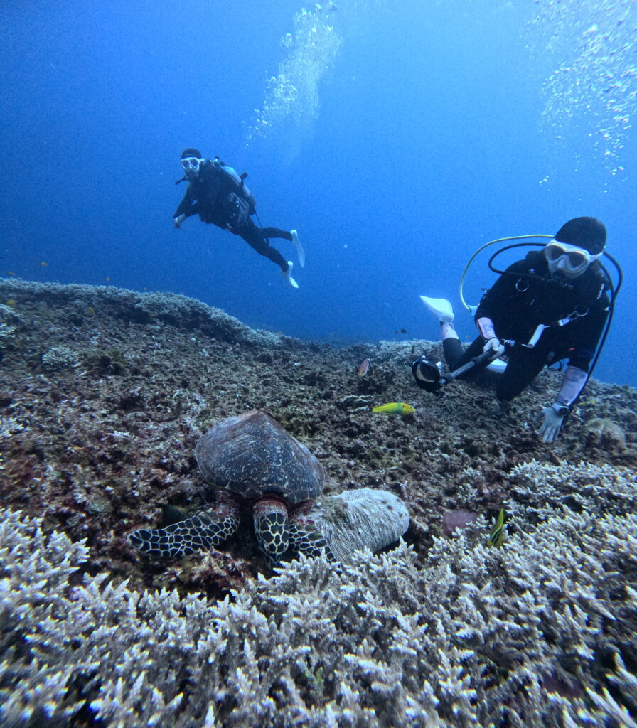最後はアンカードリフトで「アリガーケーブル」へ。浅場のサンゴは今日も生き生きとしていて、最高のコンディション!ここではアオウミガメも登場してくれました。なんと1日で「タイマイ」と「アオウミガメ」の2種類のウミガメに出会えるという、贅沢な締めくくりとなりました!