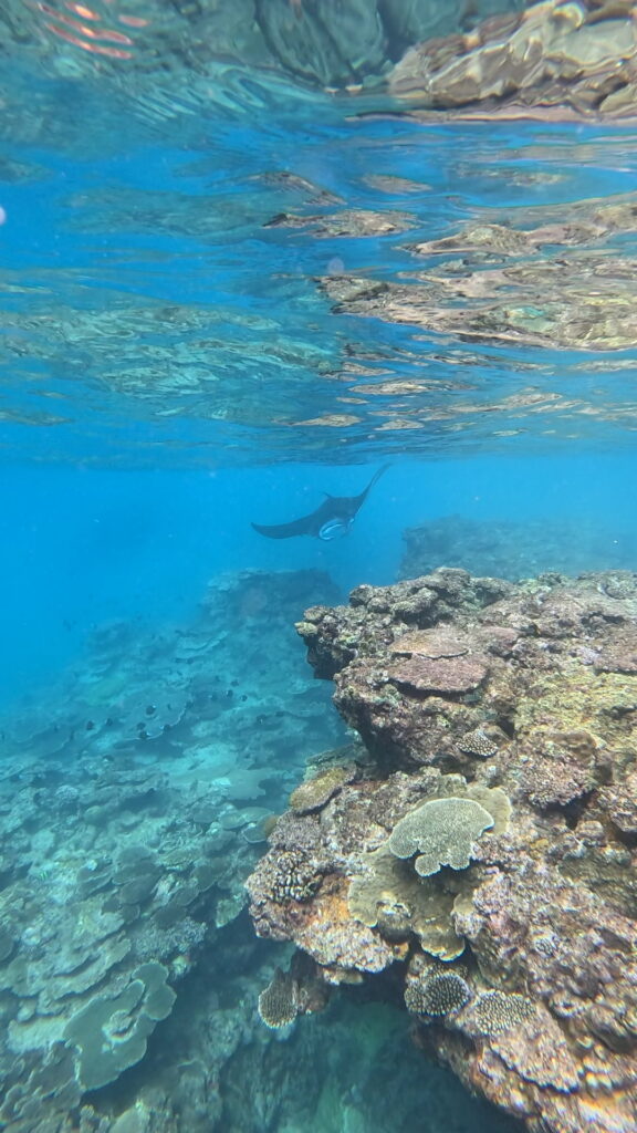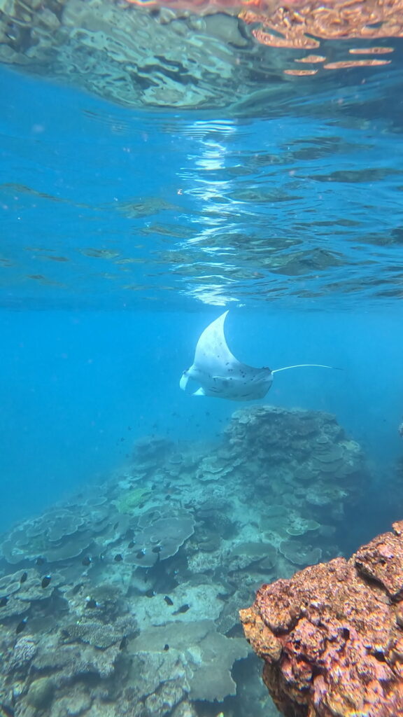 2本目は「アラリ」へ。ここでなんと、奇跡の出会いが待っていました!エントリー直前、水面近くを悠々と泳ぐマンタの姿が!