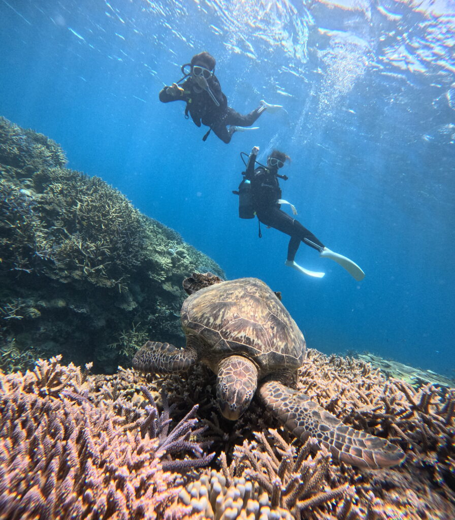 最後は「ダイマル」で、のんびりと癒やしのダイビング。3人ともすっかりダイバーの顔になり、お互いにバディを確認しながら、慶良間の美しい水中世界を心ゆくまで満喫していました。念願のウミガメもじっくり目の前で見れちゃいました!