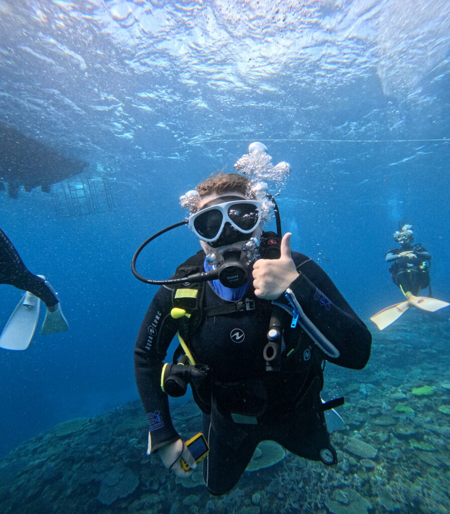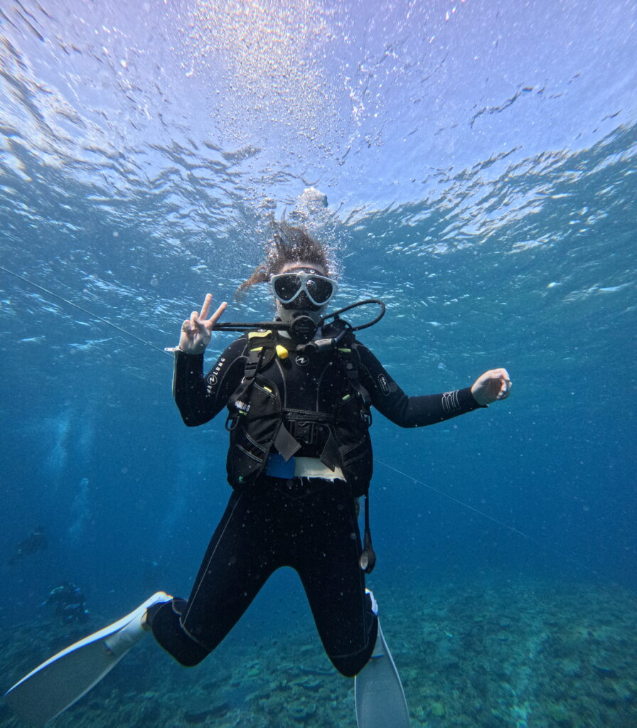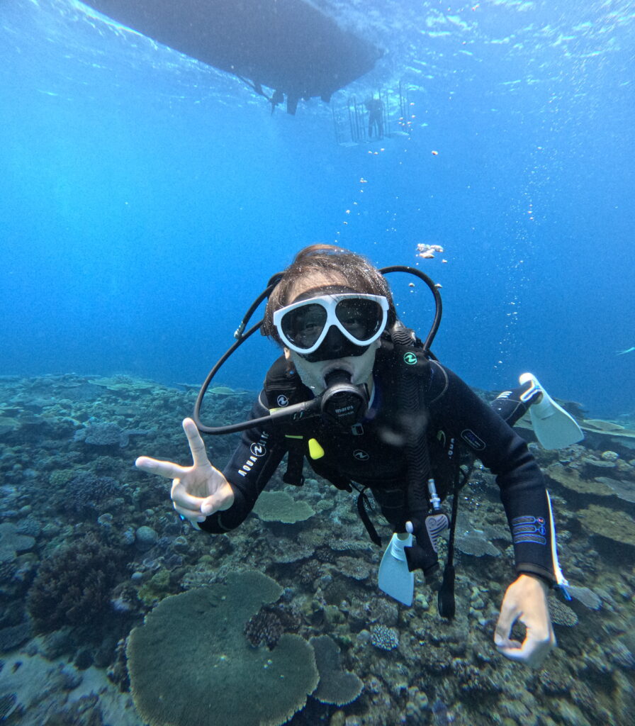 初めてのファンダイビング、1本目はアンカーリングで「クルマイ」へ。エントリーすると、そこにはケラマブルーの世界が広がっていました!講習での練習の成果がしっかりと現れ、3人ともリラックスして慶良間の海を泳ぎ始めていました。