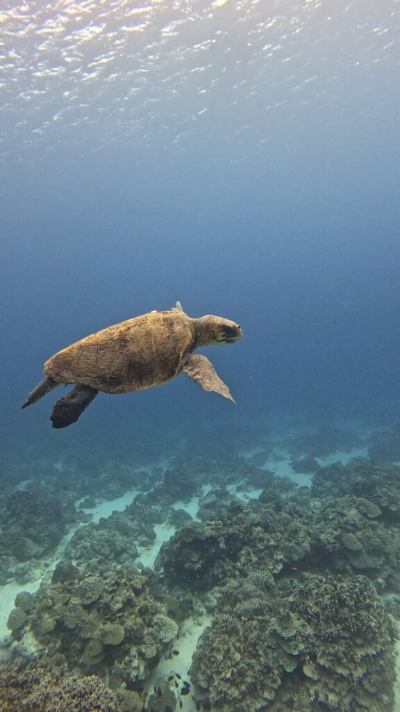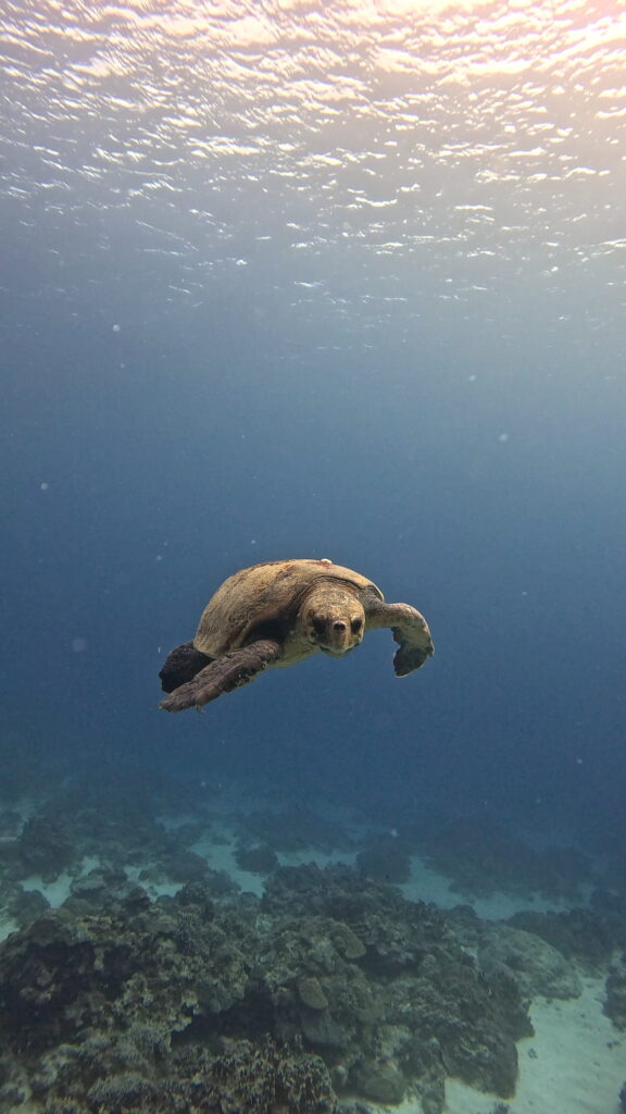 エントリーしてすぐに、慶良間でもなかなかお目にかかれないアカウミガメが登場!悠々と泳ぐその姿は、ライセンス取得を祝福してくれているかのようでした。さらに、今の時期ならではの特大サイズのコブシメにも遭遇。その圧倒的な存在感に、ゲスト様も大興奮でした!